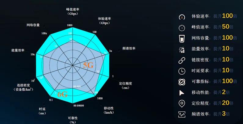 5G作為4G的延伸,也具有明顯的高速率,低時延、大容量等特征,例如:傳輸速度可達20Gbps;時延低至1ms;5G室內(nèi)定位精度3.5GHz頻段下在5m左右,毫米波定位精度可以達到3m……但6G與之相較,優(yōu)勢更為突出。